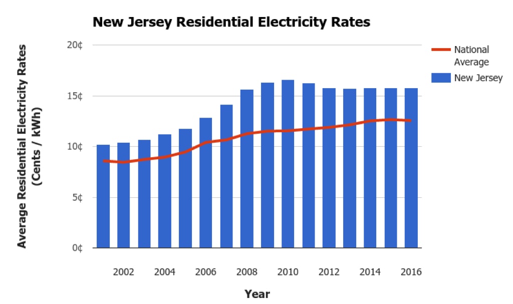 According to the U.S. Energy Information Administration, the average retail price of electricity for New Jersey residents in December 2016 was 15.32¢ per kWh, a whopping 3.11¢ above the average U.S. electricity price of 12.21¢ per kWh.
