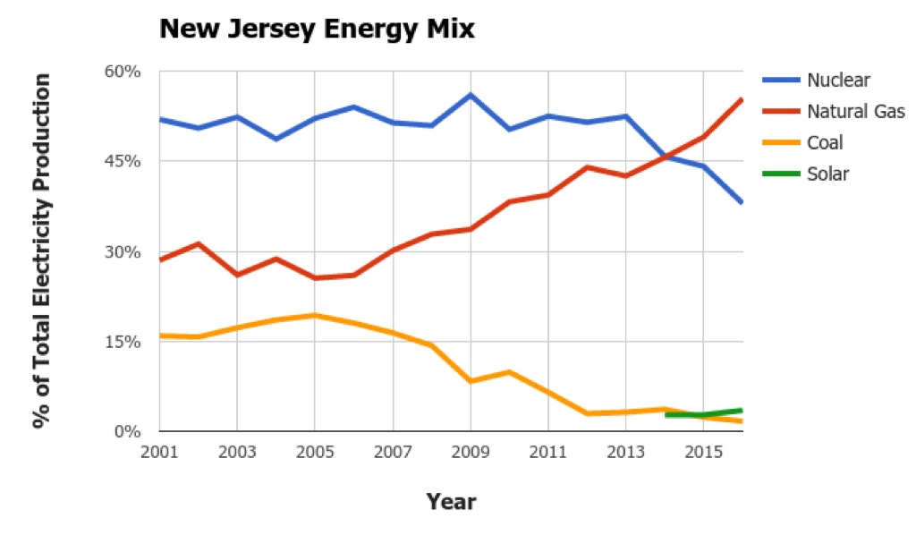 Electricity Production from natural gas has risen 73% over the past 5 year in New Jersey. Over the same period, electricity production from coal has fallen 68%.
